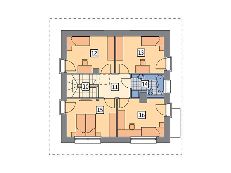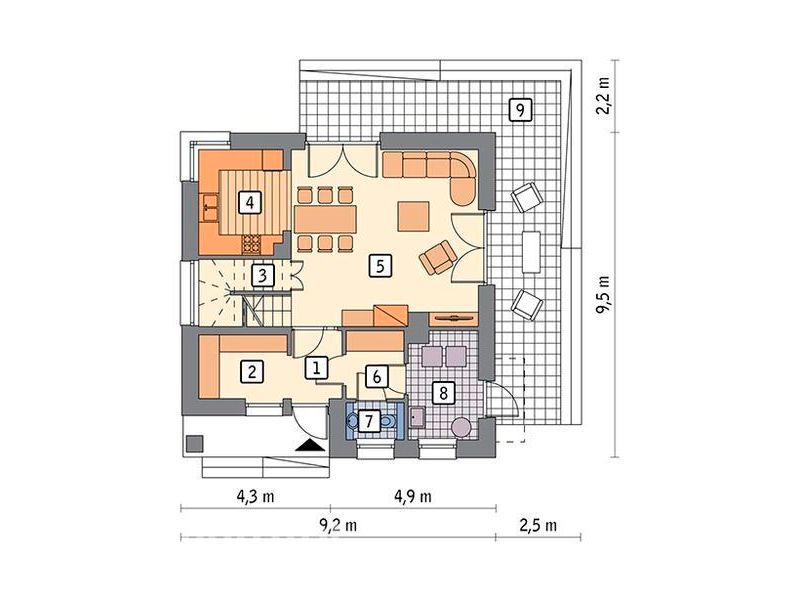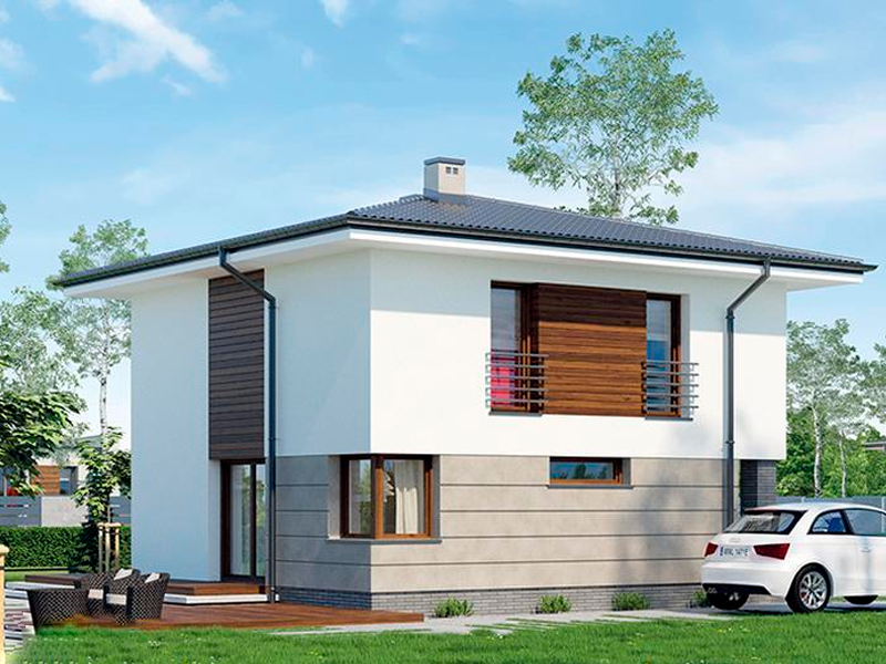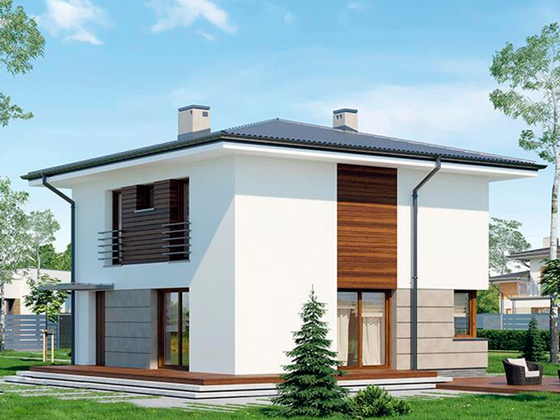 Современный дом с модной отделкой фасада, сочетает штукатурку, доски и клинкерные плитки. Первый этаж: кухня с гостиной и выходом на террасу, туалет, гардеробная, кладовая, котельная (возможна адаптация под газовый котел) и коридор. Второй этаж: четыре спальни с окнами и ванная. Удобные входы в каждую комнату из коридора.