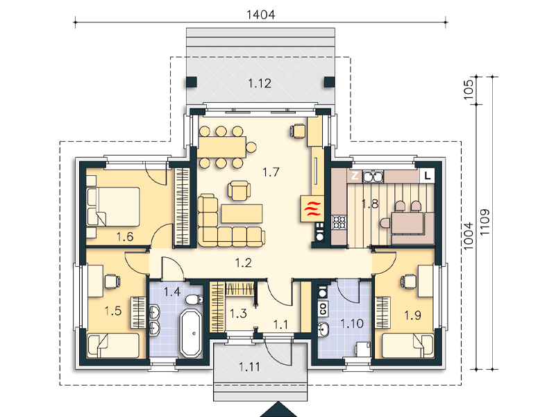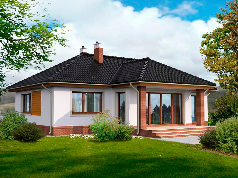 Удобный одноэтажный дом для небольшой семьи. Внутри: закрытая кухня, гостиная с камином, три спальни, ванная и подсобка с газовым котлом. В прихожей - место для шкафов, можно использовать как прачечную. Из гостиной большая дверь ведет на крытую террасу. Простой фасад украшен деревянными элементами.