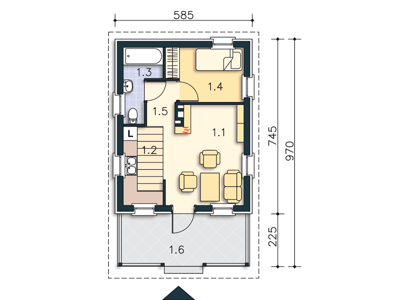 Небольшая функциональная дача, простая в строительстве. Одноэтажный дом обеспечивает комфорт на минимальной площади. Крытая терраса позволяет наслаждаться природой в любую погоду. В центре дома камин, вокруг которого расположены гостиная, кухня, ванная и спальня.
