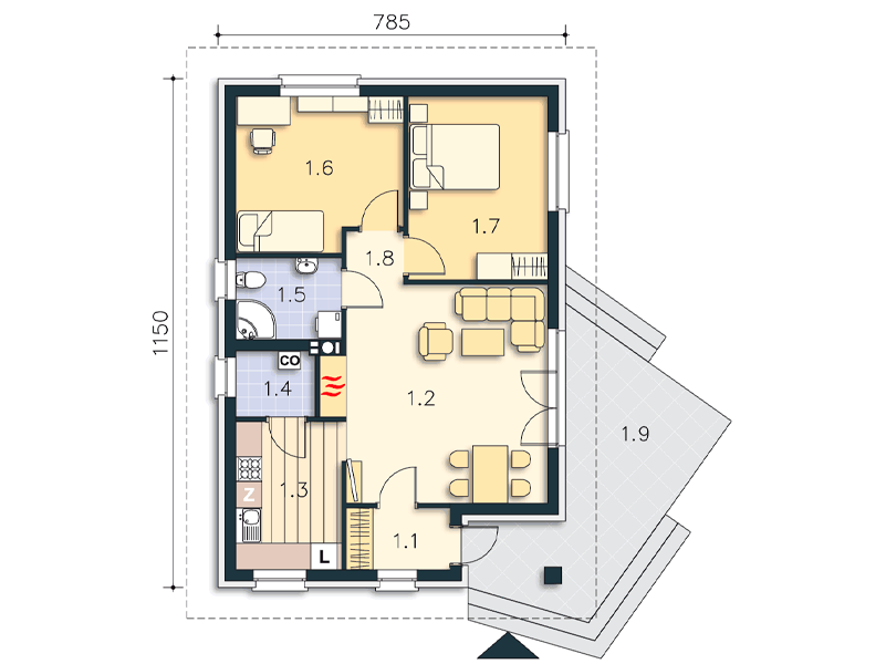Красивый, небольшой коттедж, идеальный для молодых и пожилых людей. Это версия проекта Lucca без угловых окон, но с немного большей площадью. В доме предусмотрены две спальни и гостиная с выходом в сад. Кухня оборудована кладовой. Простой корпус делает дом дешевым в строительстве.