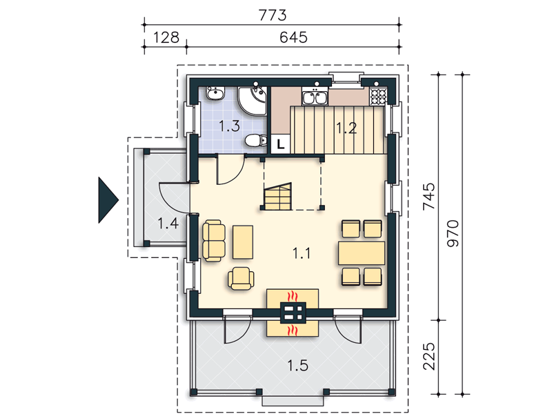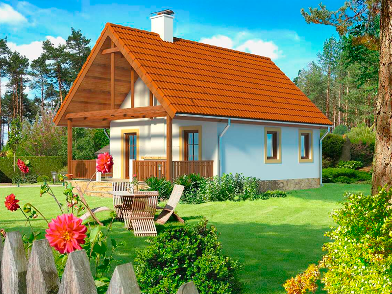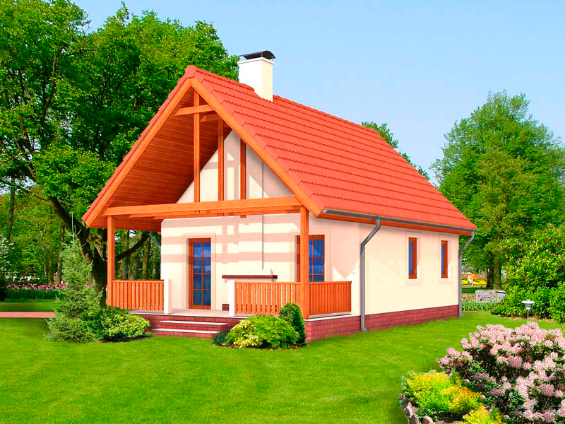 Небольшой коттедж, простой и недорогой в строительстве. Вход через крытое крыльцо. На первом этаже комната отдыха с камином и выходом на террасу, кухня и ванная. Большая крытая терраса рядом с комнатой отдыха обеспечивает тень и защиту от дождя. Деревянная лестница ведет на чердак, где находится спальня.