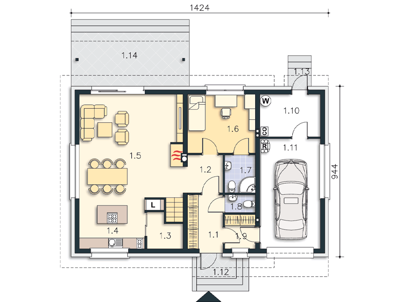 Удобный энергосберегающий дом. Первый этаж: гостиная с камином, кухня с кладовой, кабинет, ванная и туалет. Второй этаж: четыре спальни, две ванные и терраса над гаражом. Котельная за гаражом имеет выход на улицу, а в гараж можно попасть из дома. Садовые дорожки украшены беседкой защищающей от солнца.