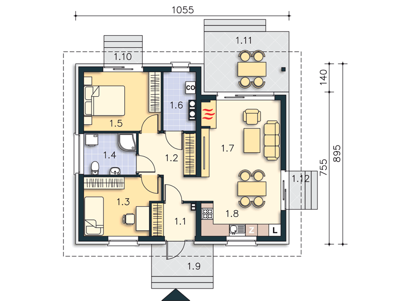 Уютный одноэтажный дом для небольшой семьи. На первом этаже: освещённая гостиная с камином, мини-кухня, столовая, две спальни, ванная и подсобка с газовым котлом. Компактный дом экономичен в строительстве и эксплуатации. Красивый дизайн с двускатной крышей и крытой террасой для отдыха на свежем воздухе.