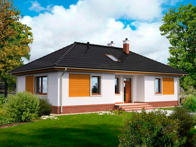 Удобный одноэтажный дом для небольшой семьи. Внутри: закрытая кухня, гостиная с камином, три спальни, ванная и подсобка с газовым котлом. В прихожей - место для шкафов, можно использовать как прачечную. Из гостиной большая дверь ведет на крытую террасу. Простой фасад украшен деревянными элементами.