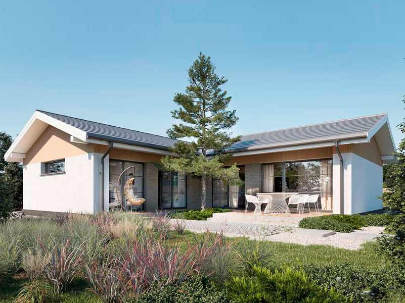 Одноэтажный дом с внутренним двором. Гостиная, кухня и спальни имеют большие окна, выходящие во двор. В доме: гостиная, кухня с обеденной зоной, две спальни, две ванны и подсобное помещение. Отопление тепловым насосом и механическая вентиляция. Идеально для молодой семьи или пожилых людей, ценящих комфорт.