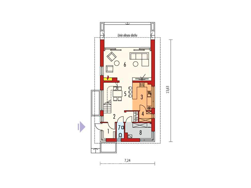 На первом этаже дома гостиная, совмещенная с кухней, дополнительная комната, ванная и котельная с выходом наружу. Второй этаж включает три спальни и ванную. Дом построен с двускатной крышей под керемическую черепицу и оснащен системой газового отопления для энергоэффективности.