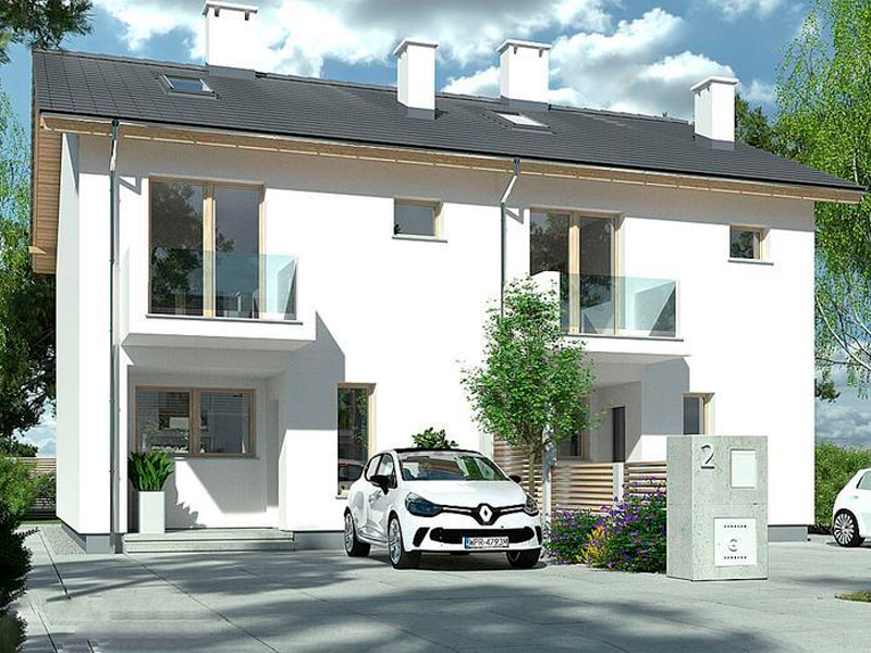 Компактный двухэтажный дом на две семьи для узких участков шириной 6м, с общей высотой 9м и без гаража. На первом этаже расположены кухня, гостиная с камином и террасой, а также ванная комната с газовым котлом. На втором этаже - три спальни и ванная. Крыша двускатная с углом 25 градусов.