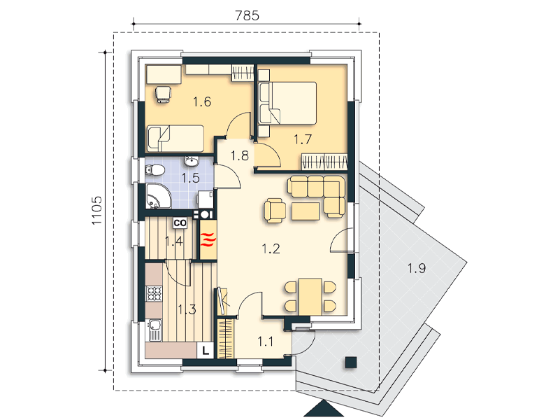 Небольшой, очаровательный дом. В доме две спальни, гостиная с камином, кухня, ванная и подсобное помещение с газовым котлом. Площадь увеличена, что сделало гостиную более просторной. Отличное, доступное в строительстве и экономичное в обслуживании одноэтажное решение для небольшой семьи или пожилой пары.