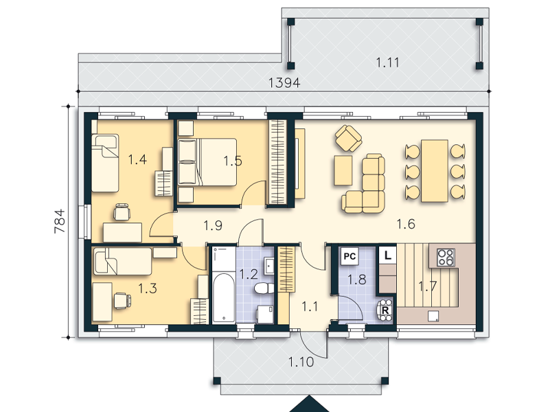 Современный одноэтажный дом с необычной крышей и большими окнами. Оптимальная площадь для семьи 2+2. В доме три спальни с выходом в сад, ванная комната, гостиная с большими окнами и отдельная кухня. Рядом с кухней находится подсобное помещение с тепловым насосом и рекуператором.