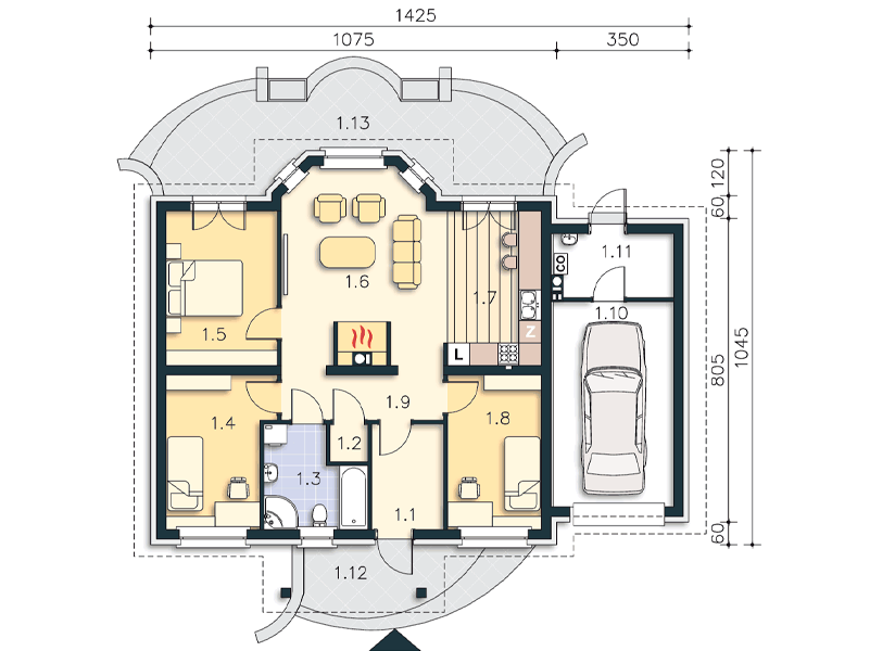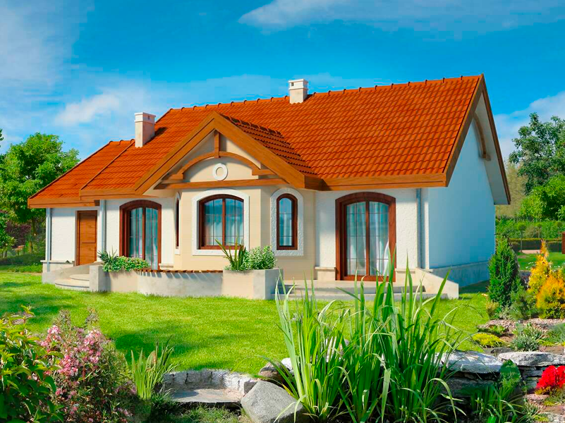 В доме есть гостиная с декоративным эркером, открытая кухня, три спальни и удобная ванная комната. Одноэтажный гараж гармонично сочетается с домом. Украшения дома включают красиво оформленное крыльцо, ставни и арочные окна в садовом фасаде.