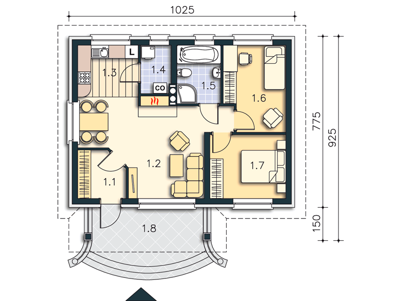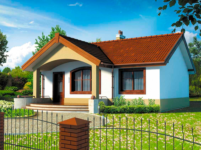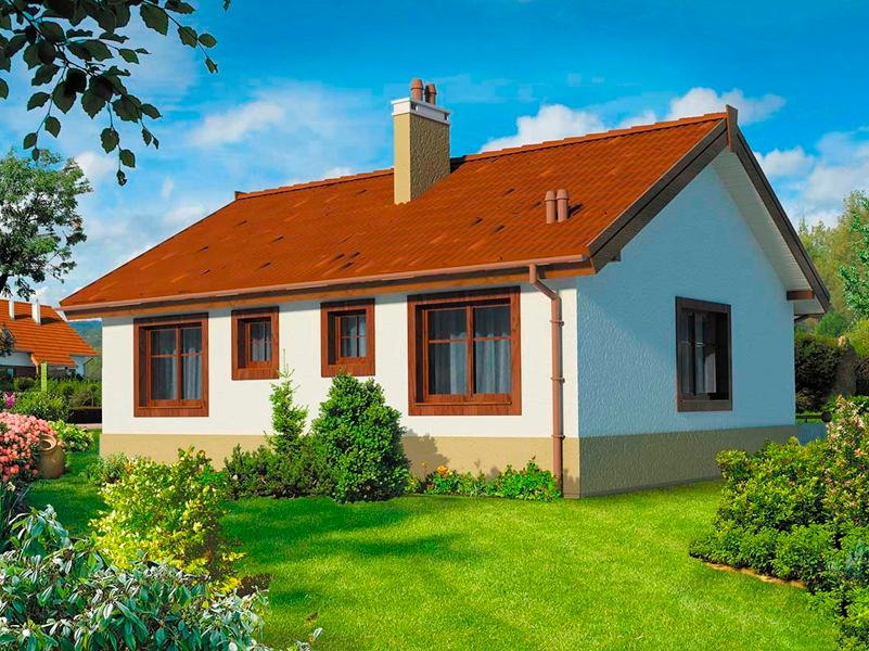 Небольшой, уютный одноэтажный дом с двускатной крышей и крытым входом со скамейкой. Большие окна обеспечивают хорошее освещение. В доме: вестибюль, гостиная с камином, кухня, подсобка, две спальни и ванная. Простая конструкция и небольшая площадь делают дом недорогим в строительстве.