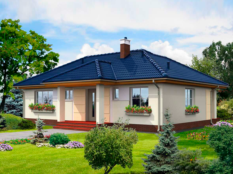 Небольшой одноэтажный дом с простой конструкцией и большой крытой террасой. Интерьер разделен на дневную и частную зоны. Гостиная соединена с кухней и имеет выход на улицу через стеклянную дверь. Большие окна хорошо освещают дом. на кухне есть подсобное помещение с котлом. В доме три спальни и ванная.