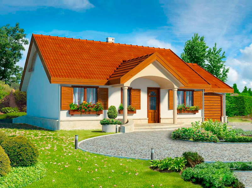 В доме есть гостиная с декоративным эркером, открытая кухня, три спальни и удобная ванная комната. Одноэтажный гараж гармонично сочетается с домом. Украшения дома включают красиво оформленное крыльцо, ставни и арочные окна в садовом фасаде.