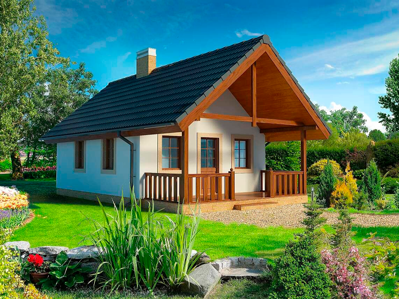 Небольшая функциональная дача, простая в строительстве. Одноэтажный дом обеспечивает комфорт на минимальной площади. Крытая терраса позволяет наслаждаться природой в любую погоду. В центре дома камин, вокруг которого расположены гостиная, кухня, ванная и спальня.