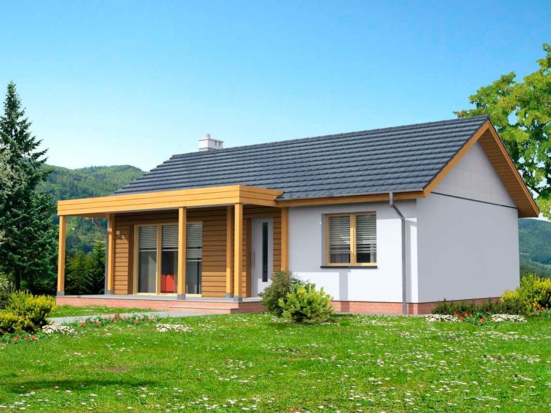 Небольшой одноэтажный дом с компактным дизайном, что снижает затраты на строительство и эксплуатацию. Он подходит для небольшой семьи или пожилой пары. Светлая гостиная с фасада позволяет строить дом на узком участке с южной ориентацией. В доме две спальни, просторная ванная комната и гостиная, совмещённая с кухней.