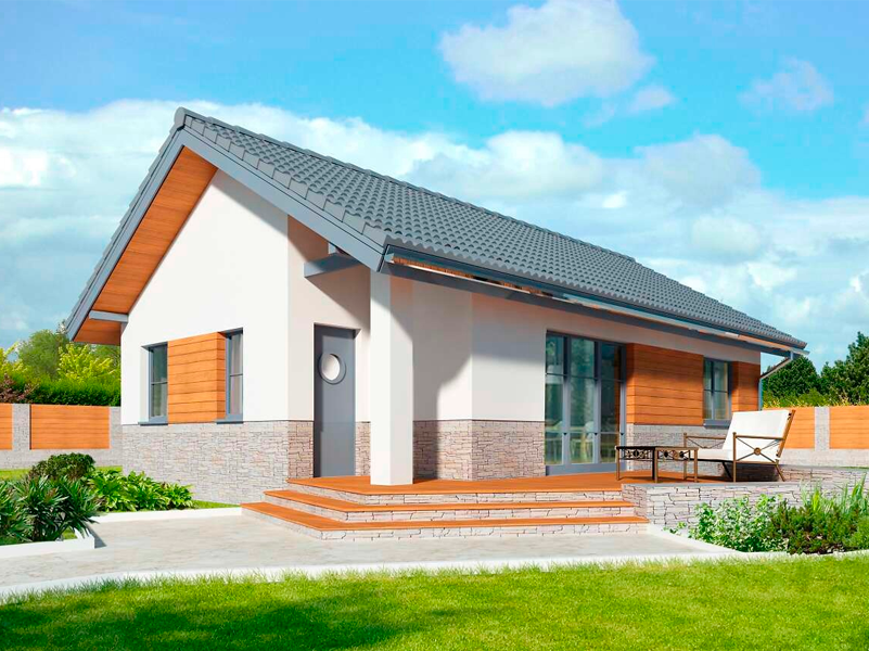 Красивый, небольшой коттедж, идеальный для молодых и пожилых людей. Это версия проекта Lucca без угловых окон, но с немного большей площадью. В доме предусмотрены две спальни и гостиная с выходом в сад. Кухня оборудована кладовой. Простой корпус делает дом дешевым в строительстве.