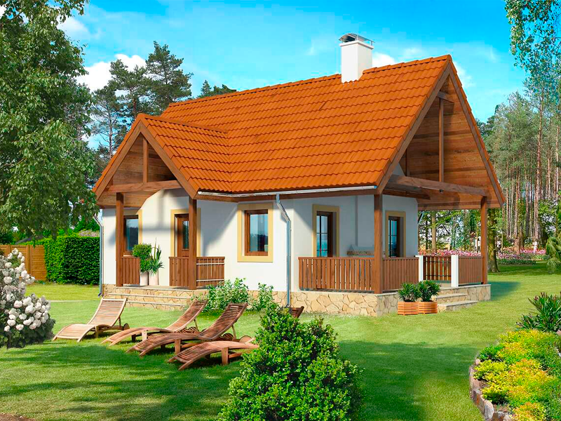 Небольшой коттедж, простой и недорогой в строительстве. Вход через крытое крыльцо. На первом этаже комната отдыха с камином и выходом на террасу, кухня и ванная. Большая крытая терраса рядом с комнатой отдыха обеспечивает тень и защиту от дождя. Деревянная лестница ведет на чердак, где находится спальня.