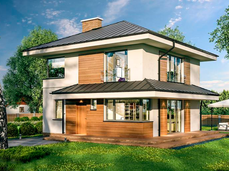 Двухэтажный дом в стиле модернизма с карнизами и большим остеклением. Светлый интерьер для семьи с 2-3 детьми. Компактный контур для небольших участков. Низкая стоимость строительства. Дополнительная комната на первом этаже может быть кабинетом или спальней.