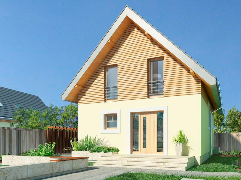 Дом, с парадным входом и пропорциональным корпусом под двускатной крышей, что делает его легким и недорогим в строительстве. Деревянные и металлические элементы фасада придают современность. Первый этаж: гостиная, открытая кухня, туалет и подсобное помещение. Второй этаж: две комнаты, одна с гардеробной, и большая ванная.
